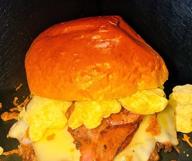 Pan potato, smash 90g/pollo cornflakes, doble queso edam ,pollo pullpork, salsa bourbon.