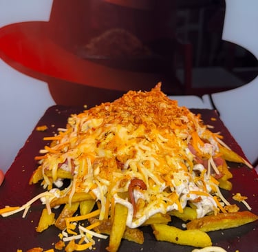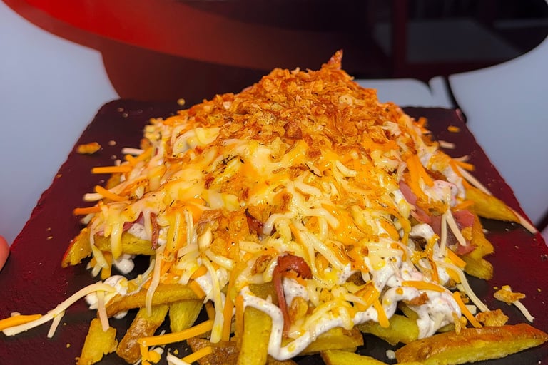 Patatas fritas con bacon, salsa mayonesa trufada casera, mix de quesos fundidos y cebolla frita.