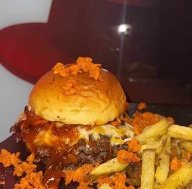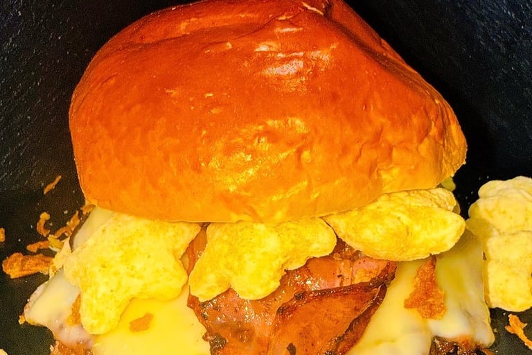 Pan potato, smash 90g/pollo cornflakes, mix de quesos fundido, salsa mermelada de bacon y Doritos bits