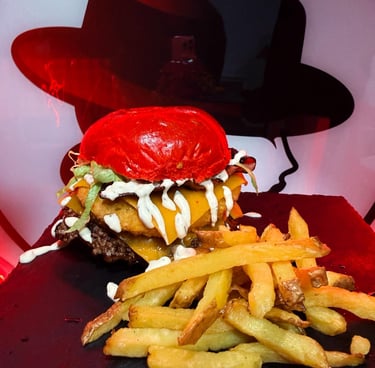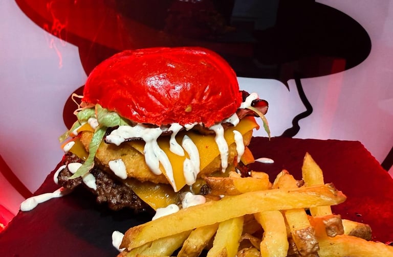 Pan potato rojo, smash 90g, pollo cornflakes, lechuga, tomate, cheddar, bacon y salsa ranchera