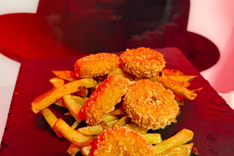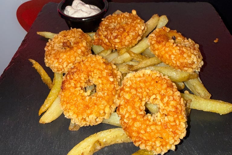 Pan potato, smash 90g/pollo cornflakes, queso cheddar, queso edam, y aros de queso gouda, salsa baconesa