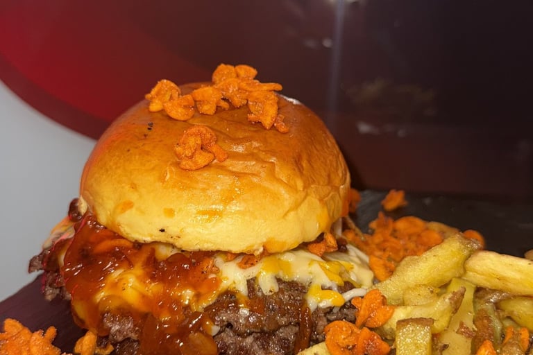 Pan potato, smash 90g vacuno, doble queso edam, salsa jumpers casera, cebolla frita y jumpers